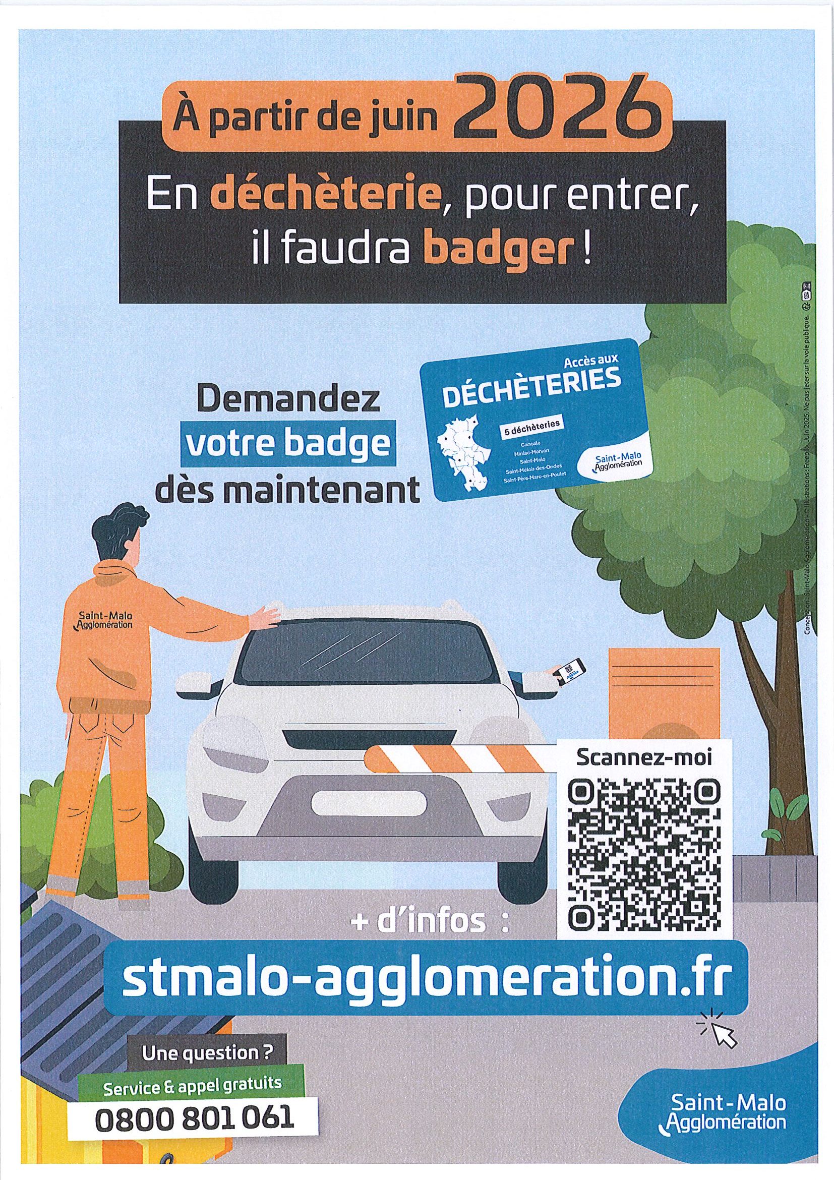 Dès juin 2026, les habitants des 18 communes de Saint-Malo Agglomération devront s’équiper d’un badge pour se rendre dans les cinq déchèteries de l’Agglomération (Cancale, Miniac-Morvan, Saint-Malo, Saint-Méloir-des-Ondes et Saint-Père-Marc-en-Poulet). Si ce nouveau moyen d’accès n’entrera donc pas en vigueur avant l’an prochain, il peut être obtenu gratuitement dès à présent et pourra être utilisé de manière illimitée.