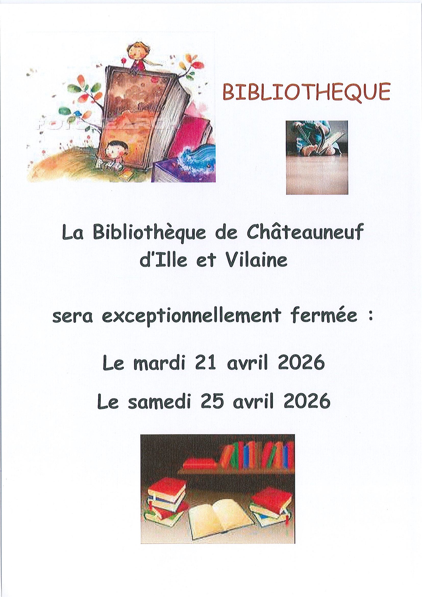 20 Avr Fermeture exceptionnelle de la bibliothèque Posted at 08:39h in Actualités by Mairie de Chateauneuf d'Ille et Vilaine