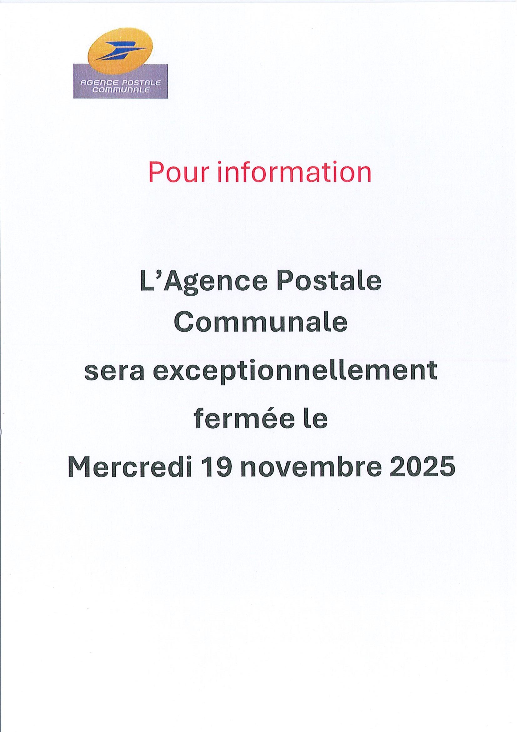 17 Nov Fermeture exceptionnelle de l’Agence Postale Communale Posted at 09:32h in Actualités by Mairie de Chateauneuf d'Ille et Vilaine