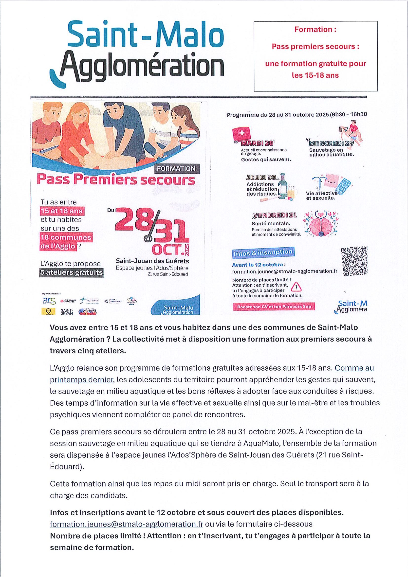 23 Sep Pass’ Premiers Secours pour 15 jeunes de l’agglomération entre 15 et 18 ans Posted at 09:28h in Actualités by Mairie de Chateauneuf d'Ille et Vilaine